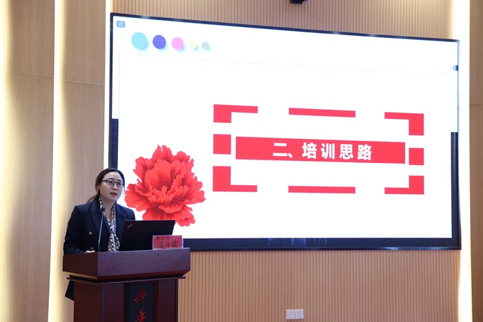 王小霞首先介绍了教师培训的总体目标和工作思路,详细阐述了“五三三五”教师发展体系和“三工程-九模块”培训体系的原则、内容及方式,随后介绍了学分认定的标准、流程、结果应用。